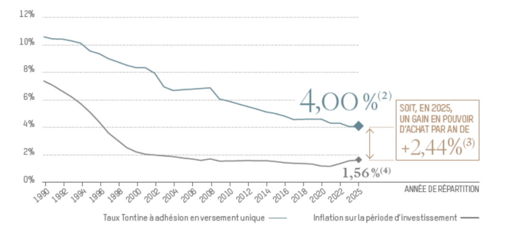 (4) Inflation capitalisée sur une durée correspondant à celle servant de base pour les calculs du rendement annuel moyen en Tontine.